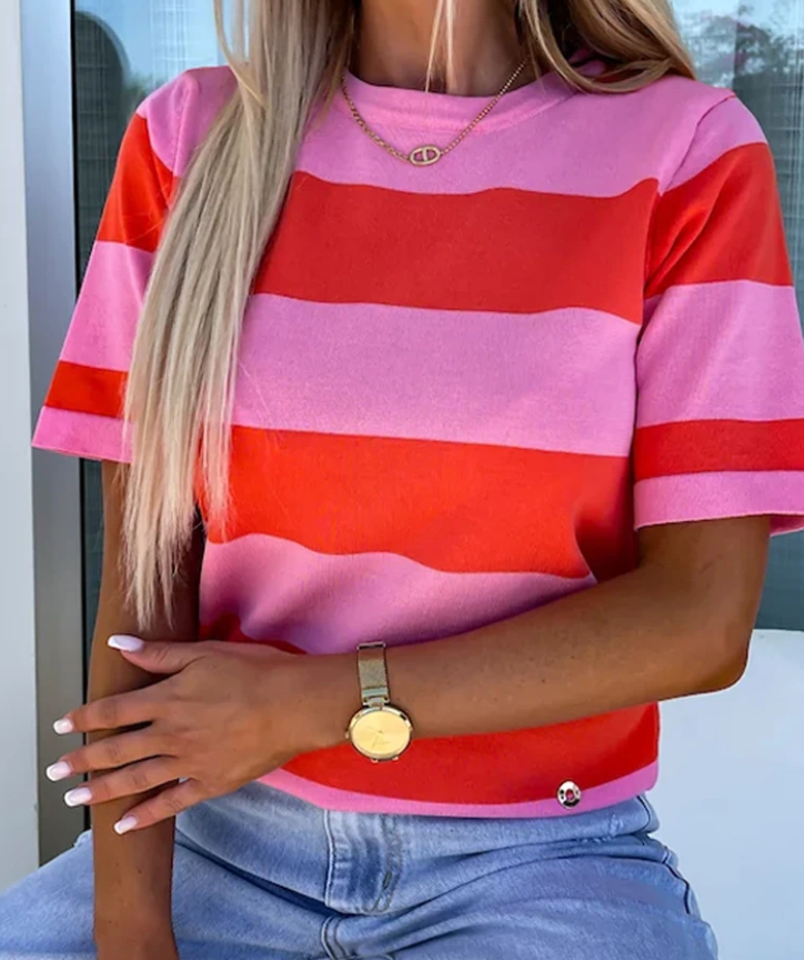Bold stripes are a fun pop to go with anything. Great length and more fitted than some but not tight.