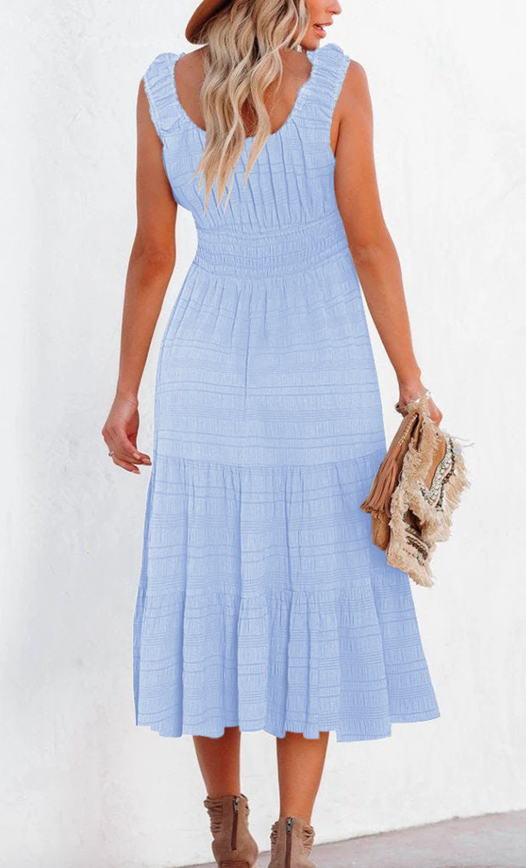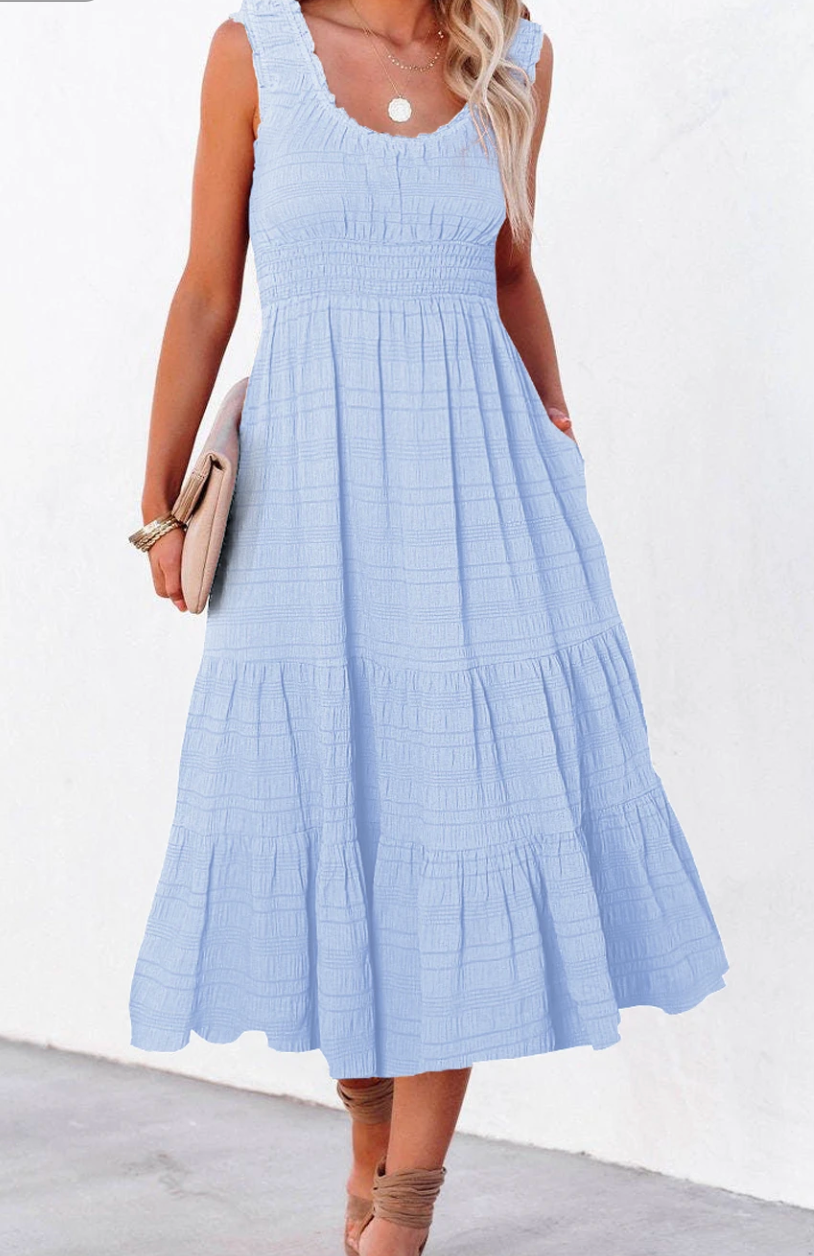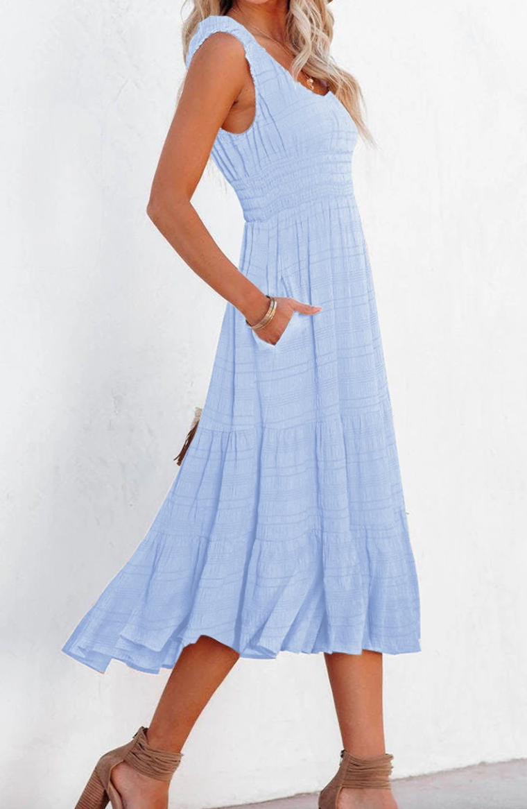 That midi length just hits right. Great for all heights. This dress has so many things going for it! The first of which is the lower neckline. The smocking at the waist is a close second. This is going to hit a lot of us in all the right places.