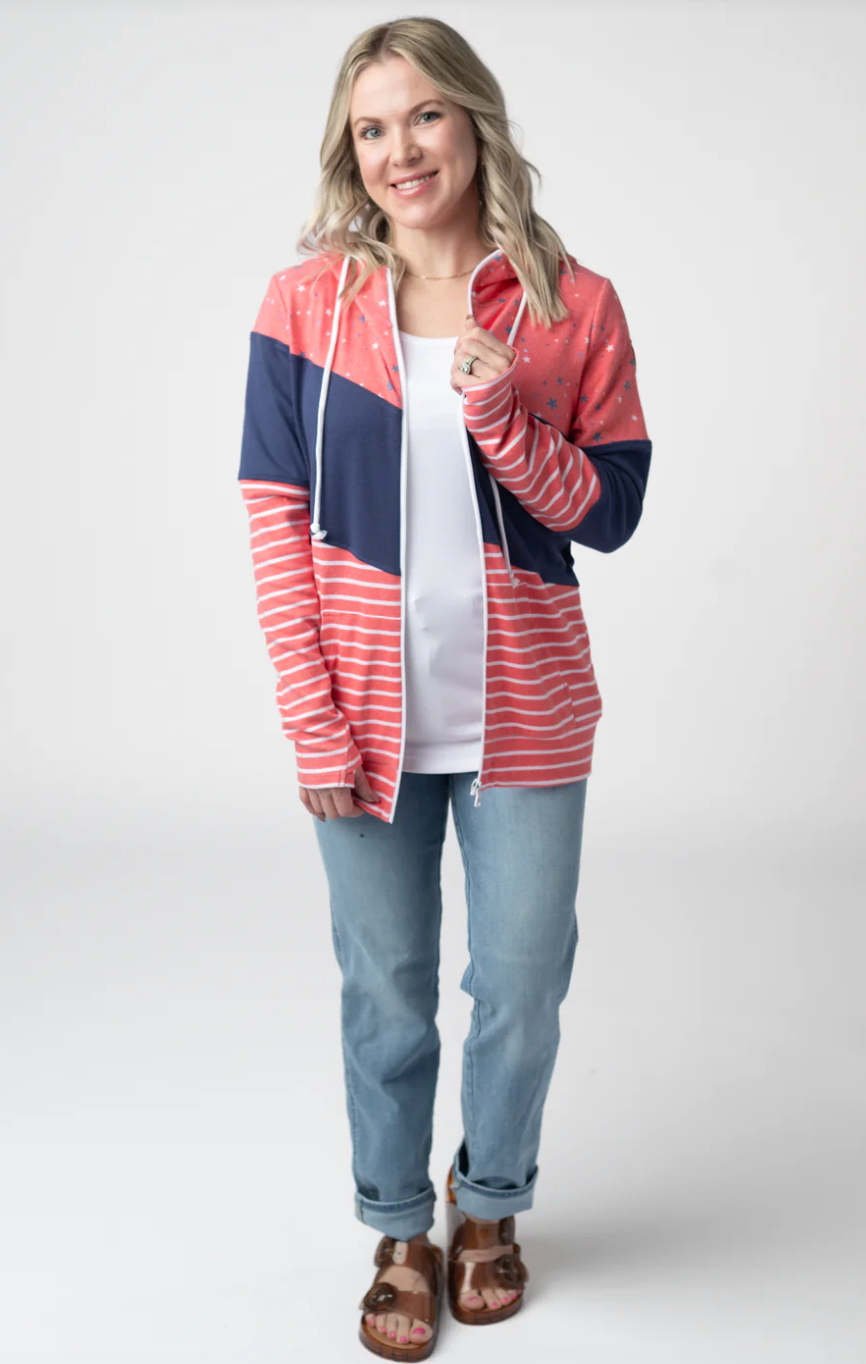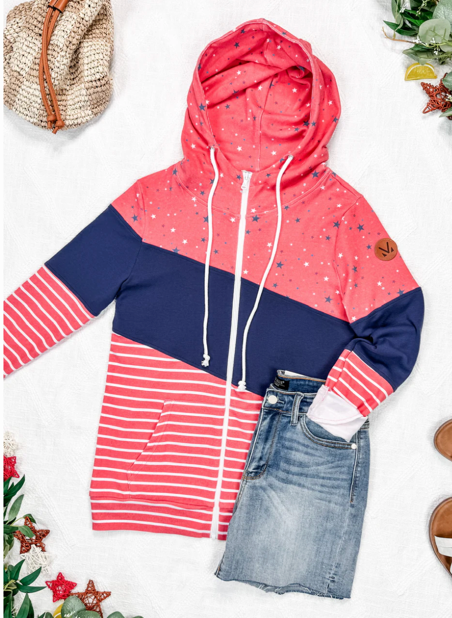 Be bold and make a statement this 4th of July with the liberty star, navy and stripes fullzip hoodie! Featuring a trendy colorblock, high stretch with a summer weight. This hoodie is perfect for the risk-taker who loves to stand out. Made with stretchy fabric for ultimate comfort, this hoodie will keep you looking stylish and feeling confident all season long.