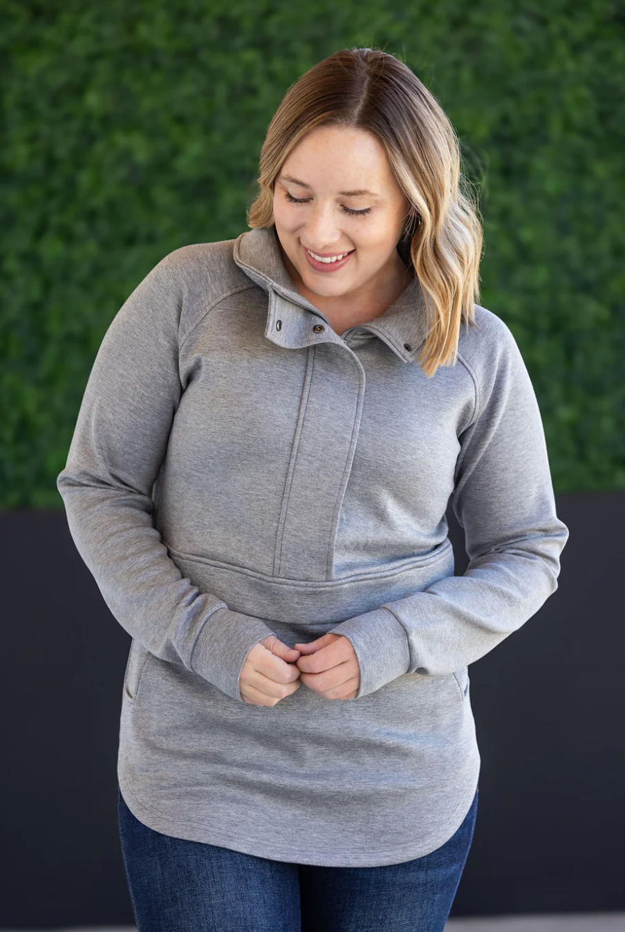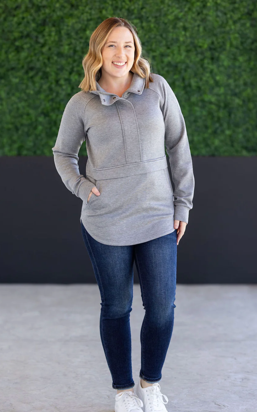 Unleash your playful side with the Mia Scuba Halfzip. Made from scuba fabric, this pullover features a faux center lappet, halfzip, pockets, and two snap buttons at the collar for extra warmth. With a curved hemline and cuff sleeves, it's perfect for adding a touch of quirk to any outfit. (And yes, it's as fun to wear as it sounds!)
