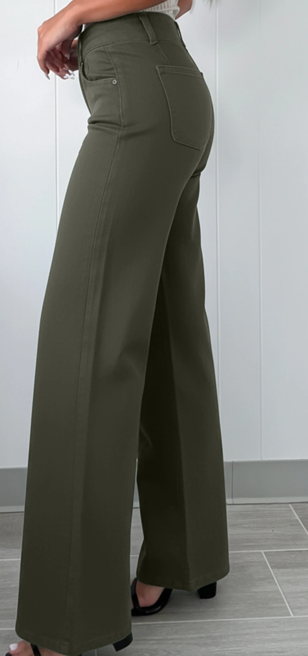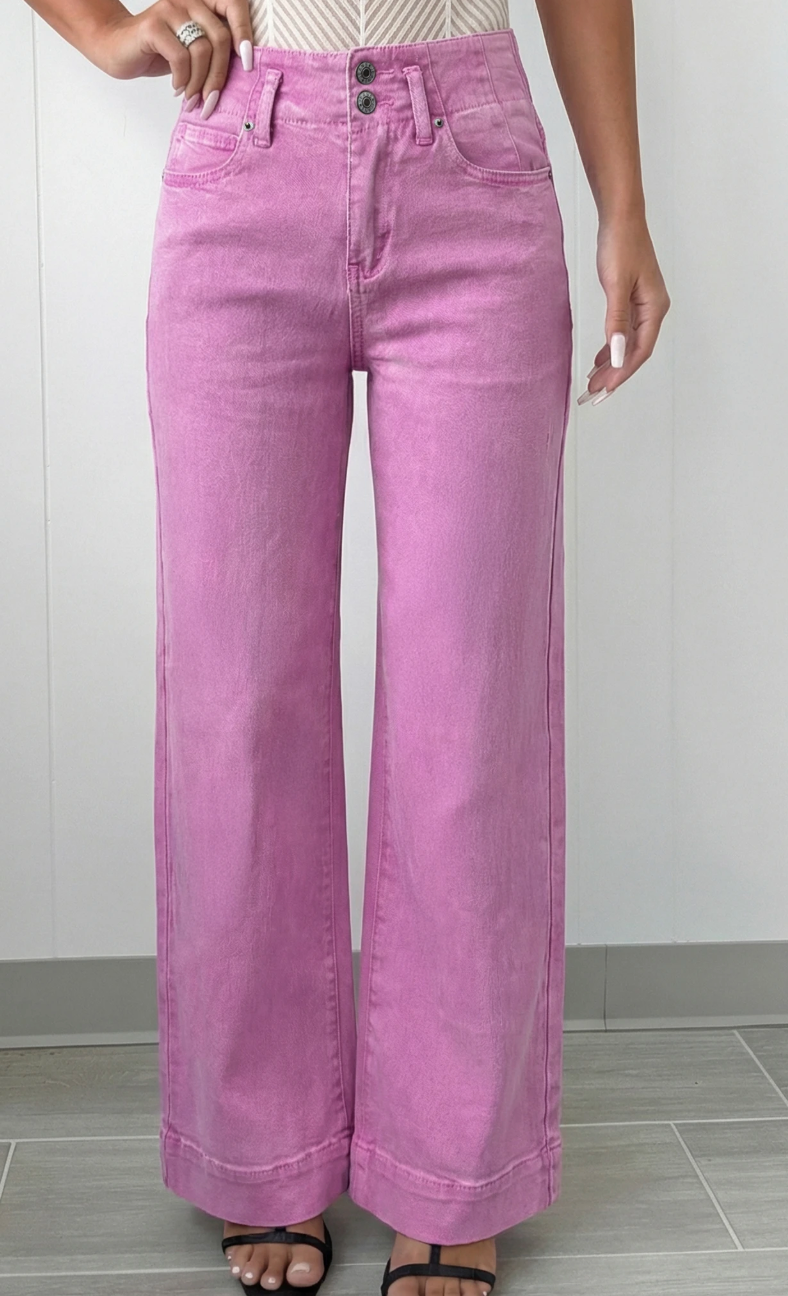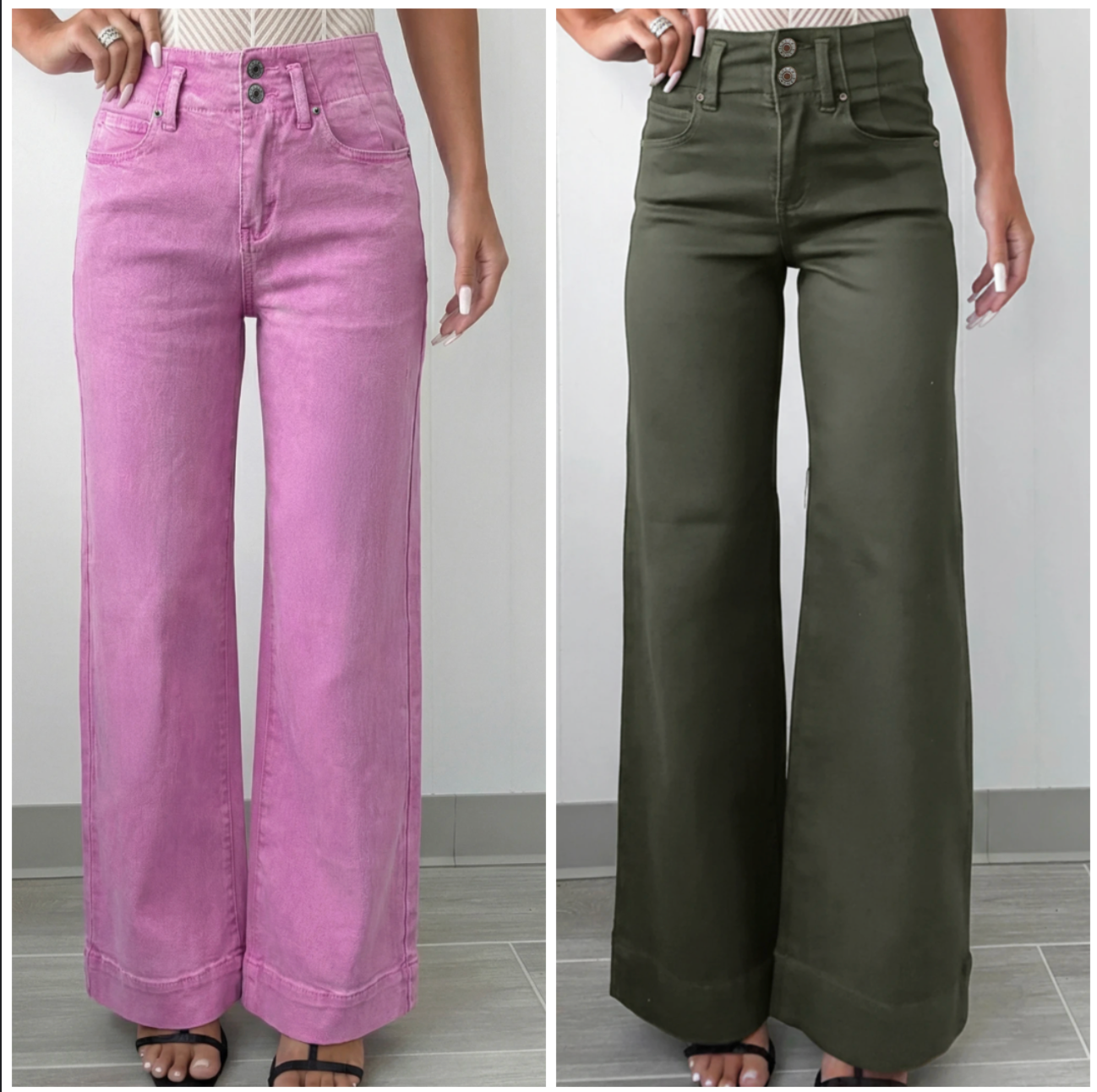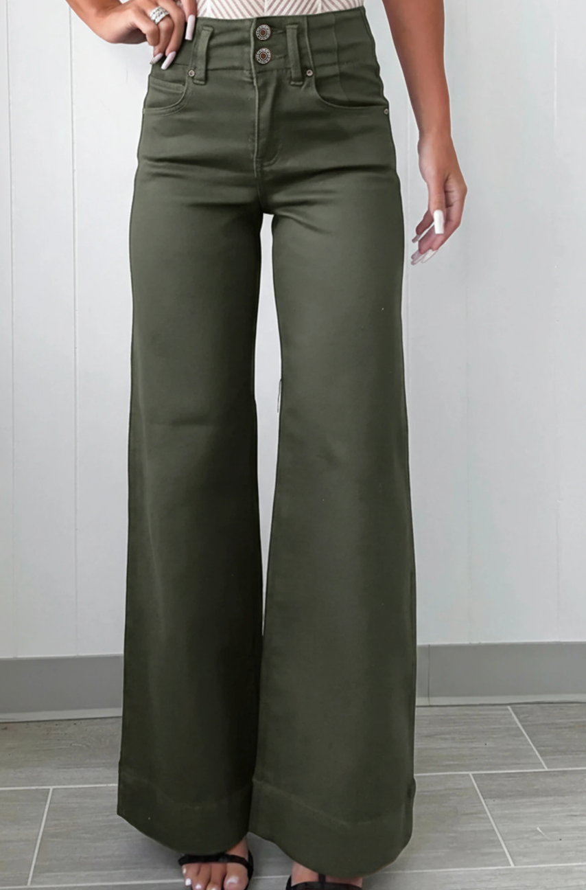 The vibe is all high waisted and the double button is super flattering. Fun wide leg and perfection for Spring.