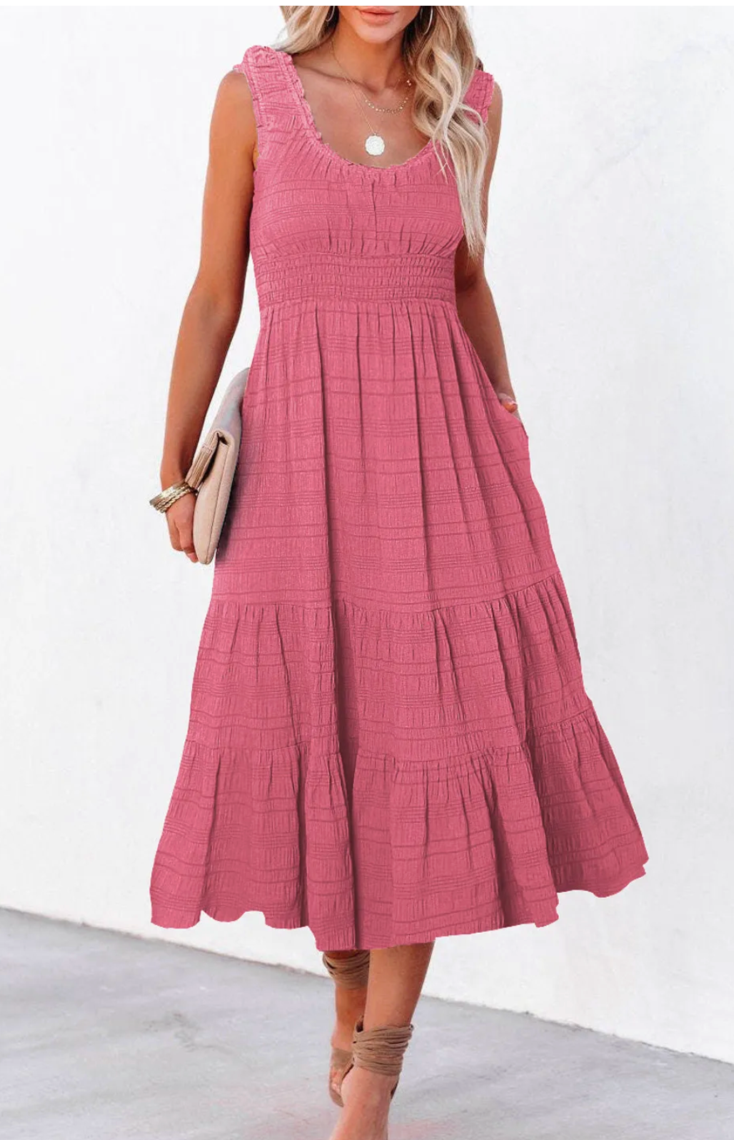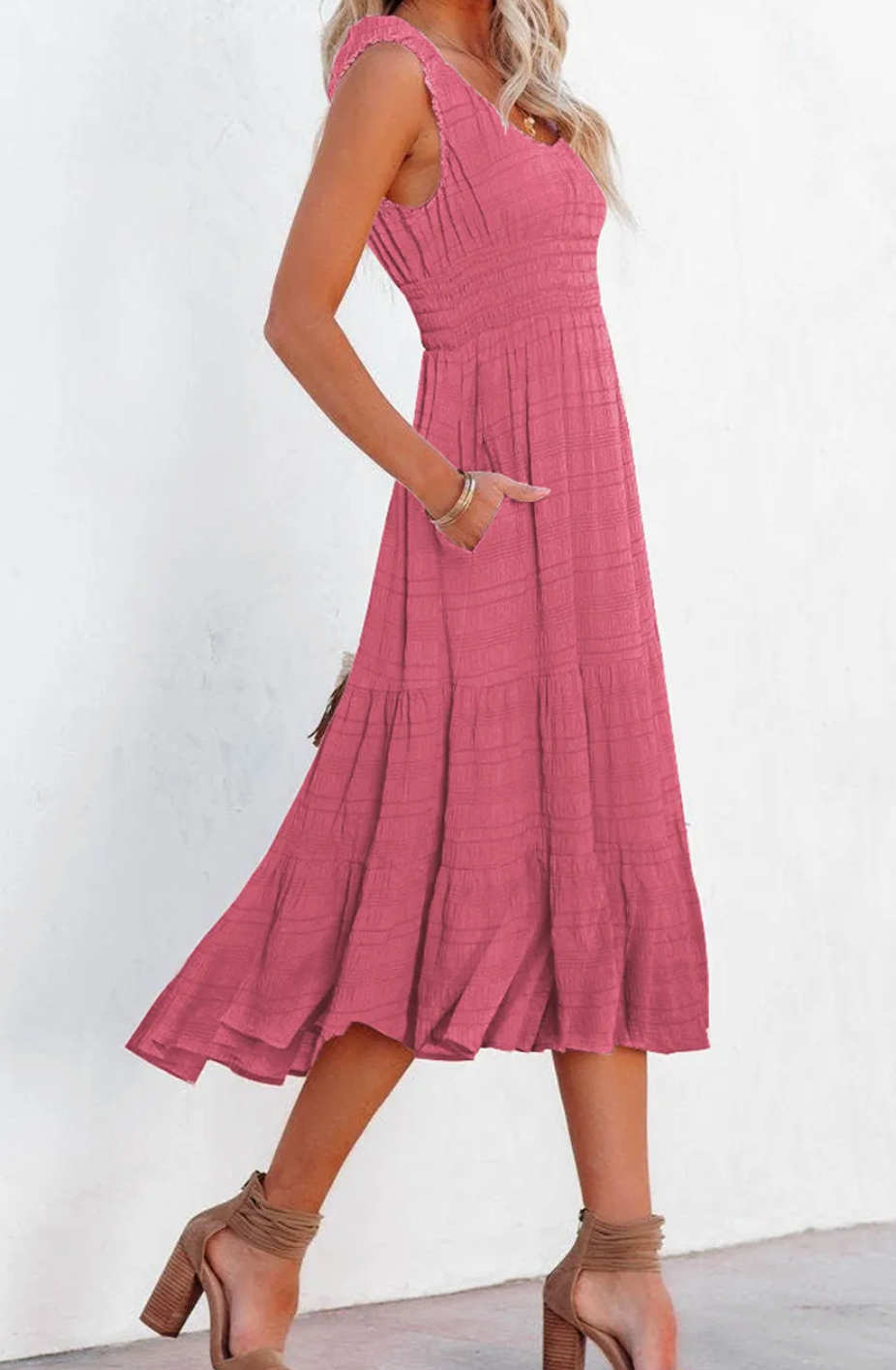 That midi length just hits right. Great for all heights. This dress has so many things going for it! The first of which is the lower neckline. The smocking at the waist is a close second. This is going to hit a lot of us in all the right places.