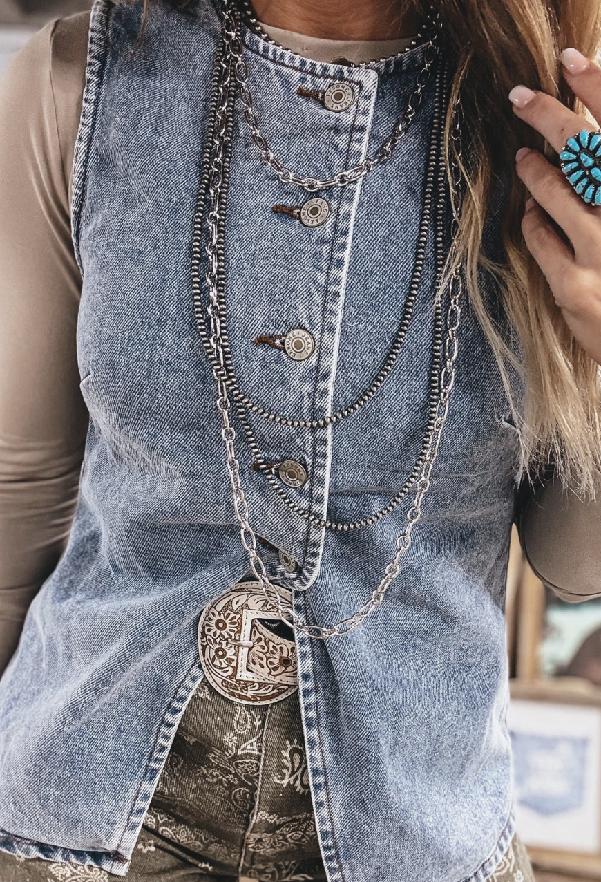 I love this vibe. I think you can be country or not but the cut is next level and I'm here for it. Fun layered with a long sleeve now or on it's own later. She's an all year kind of gal.