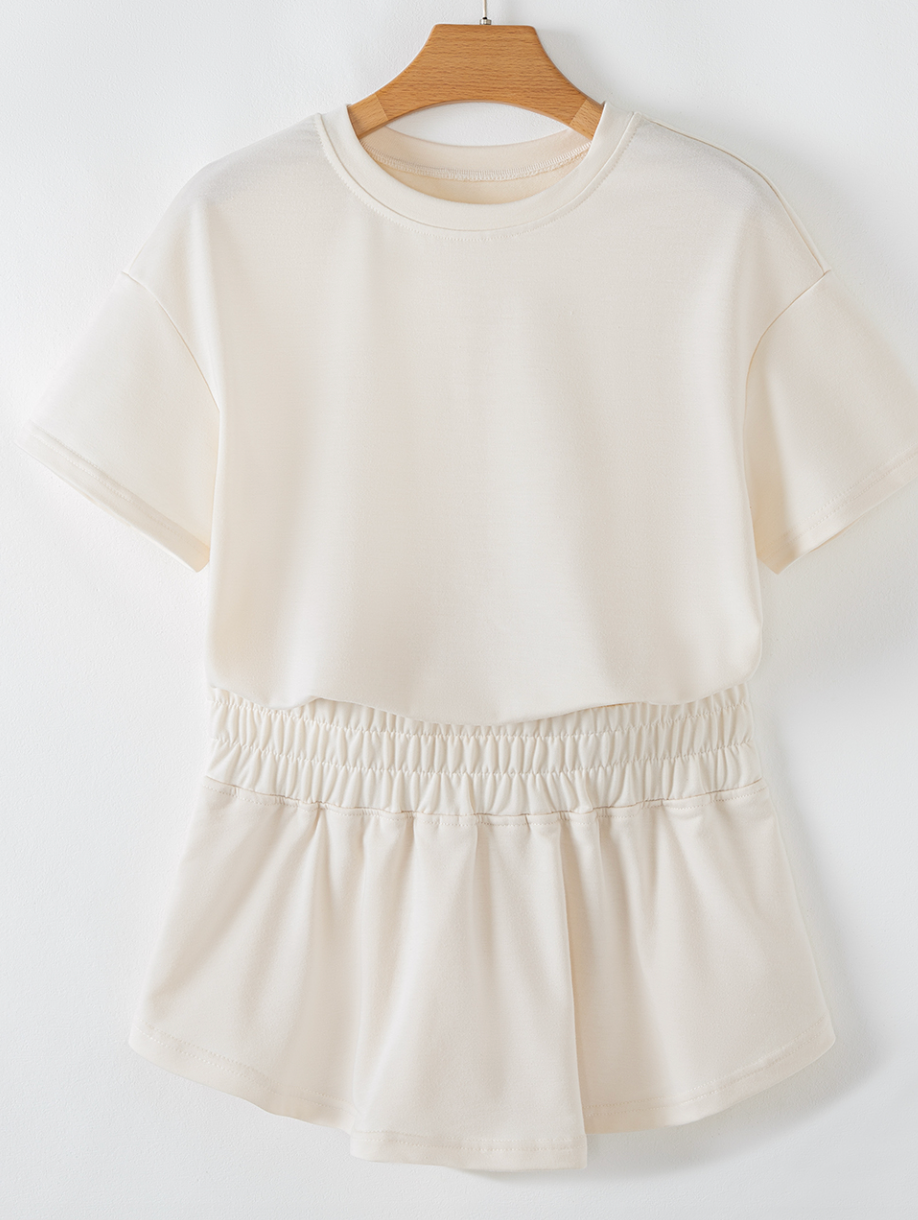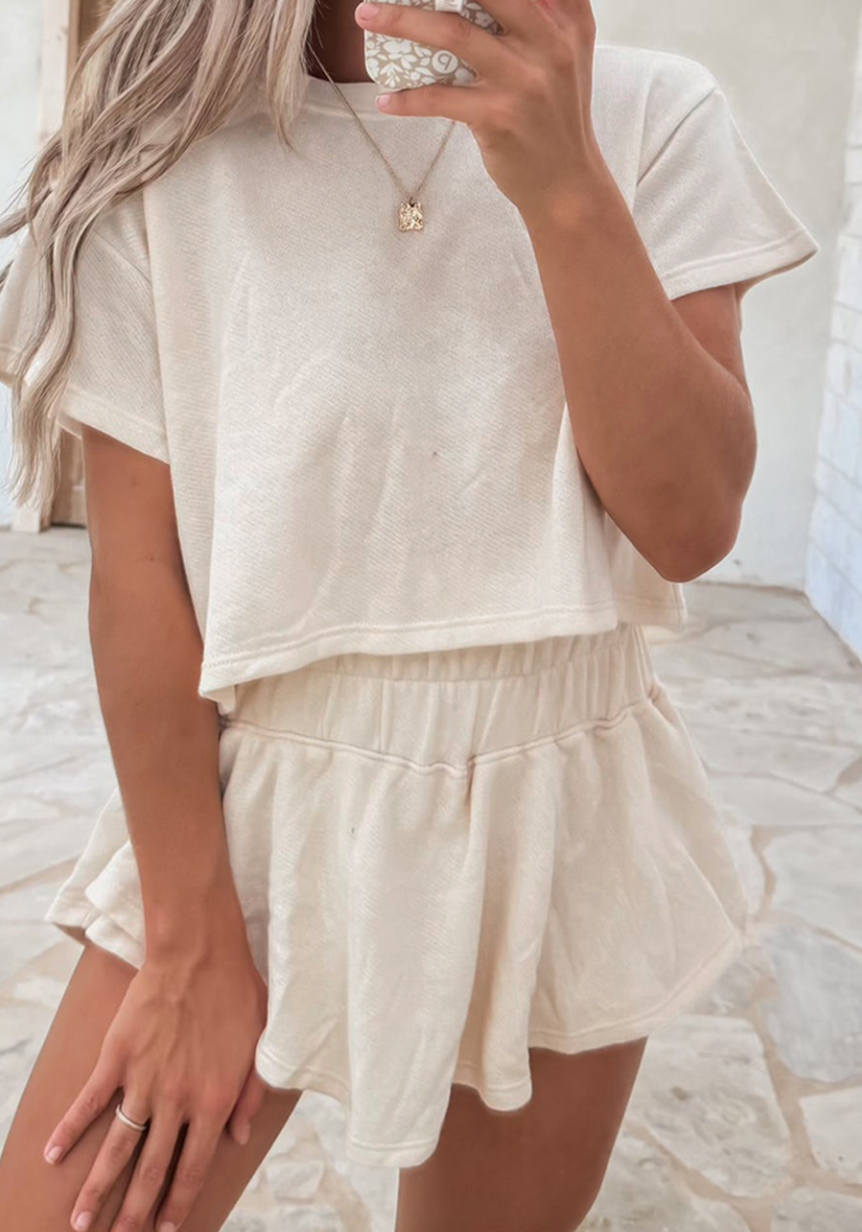 Same as the checkered set I am obsessed with but more cotton in this fabric. I can't say enough about how flattering this cut is and comfortable too. I have NEVER been a crop girl but this just works.