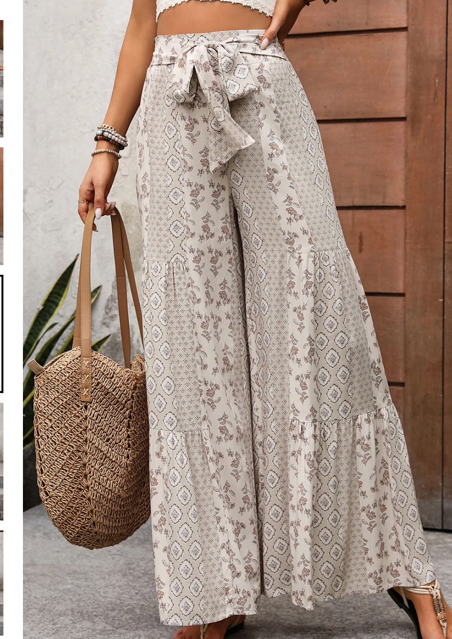 The color way on this is so good. They are coming to the shop. Elastic waistband and a fun wide leg with a tie at the waist. Just pair with a tank and denim jacket.