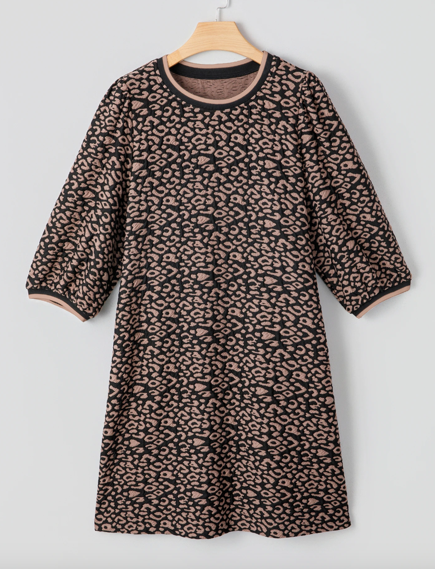 Leopard texture and a fun sleeve. Great with all your boots. Would be fun with tights too. Great stretch and a fun fit.