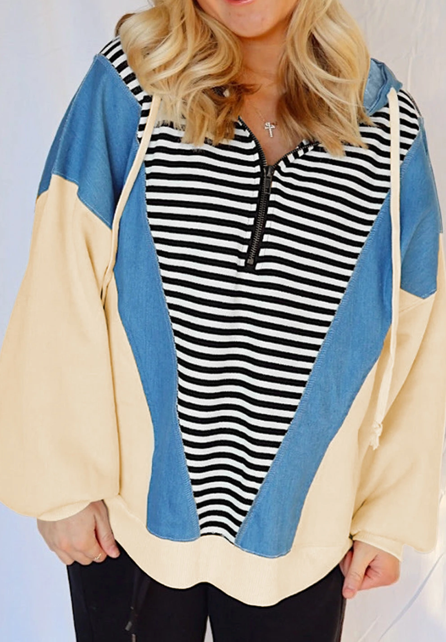 I love a good fabric mix and I can't think of anything better than cream and denim with a black and white stripe. Plus this one is a hoodie. Oversized fit.
