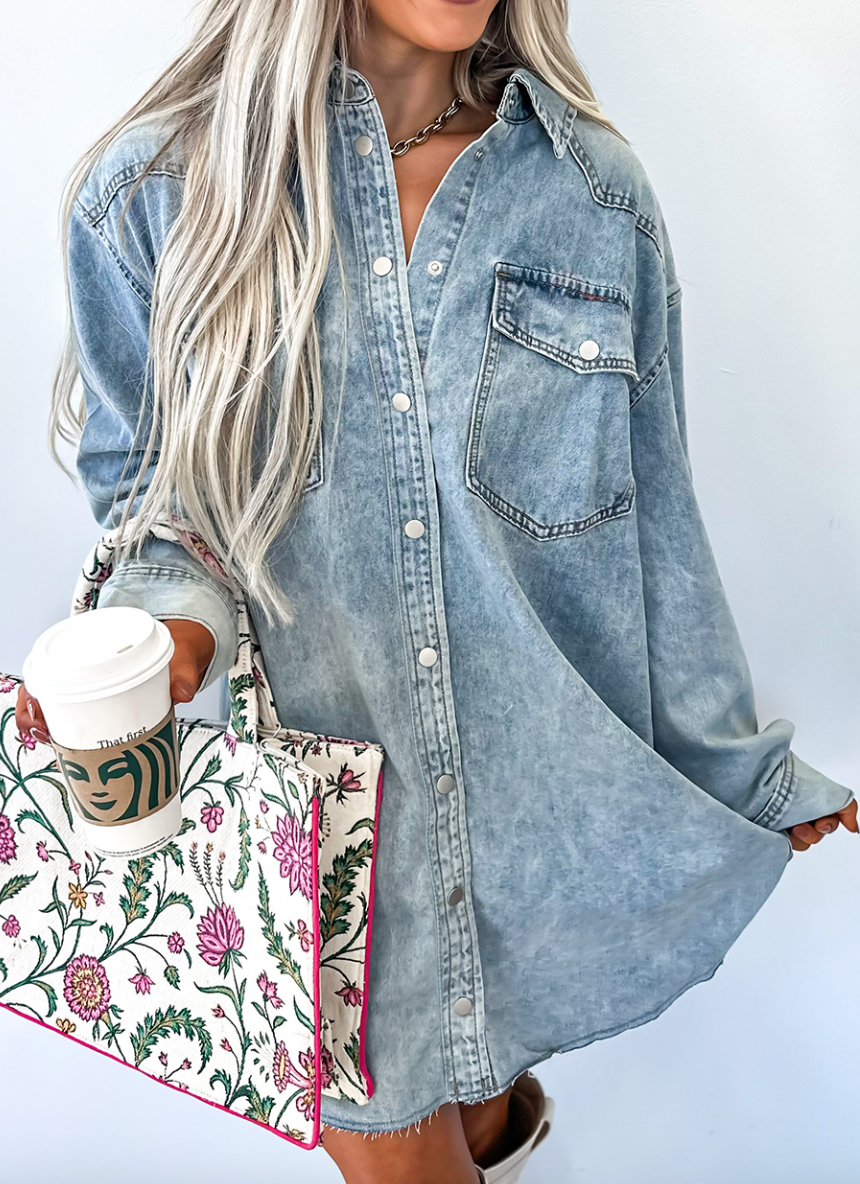 The perfect shirt/dress for layering. I wear mine under all the things and it matches them perfectly. So fun on it's own with leggings or tights or layered with any sweater or cardigan. Denim everything!