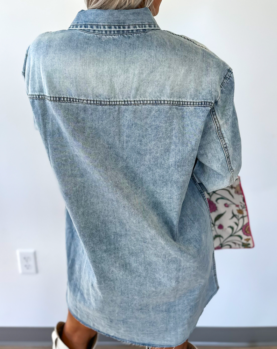 Pre-Order Blue Chest Pocket Raw Hem Denim Loose Shirt Dress