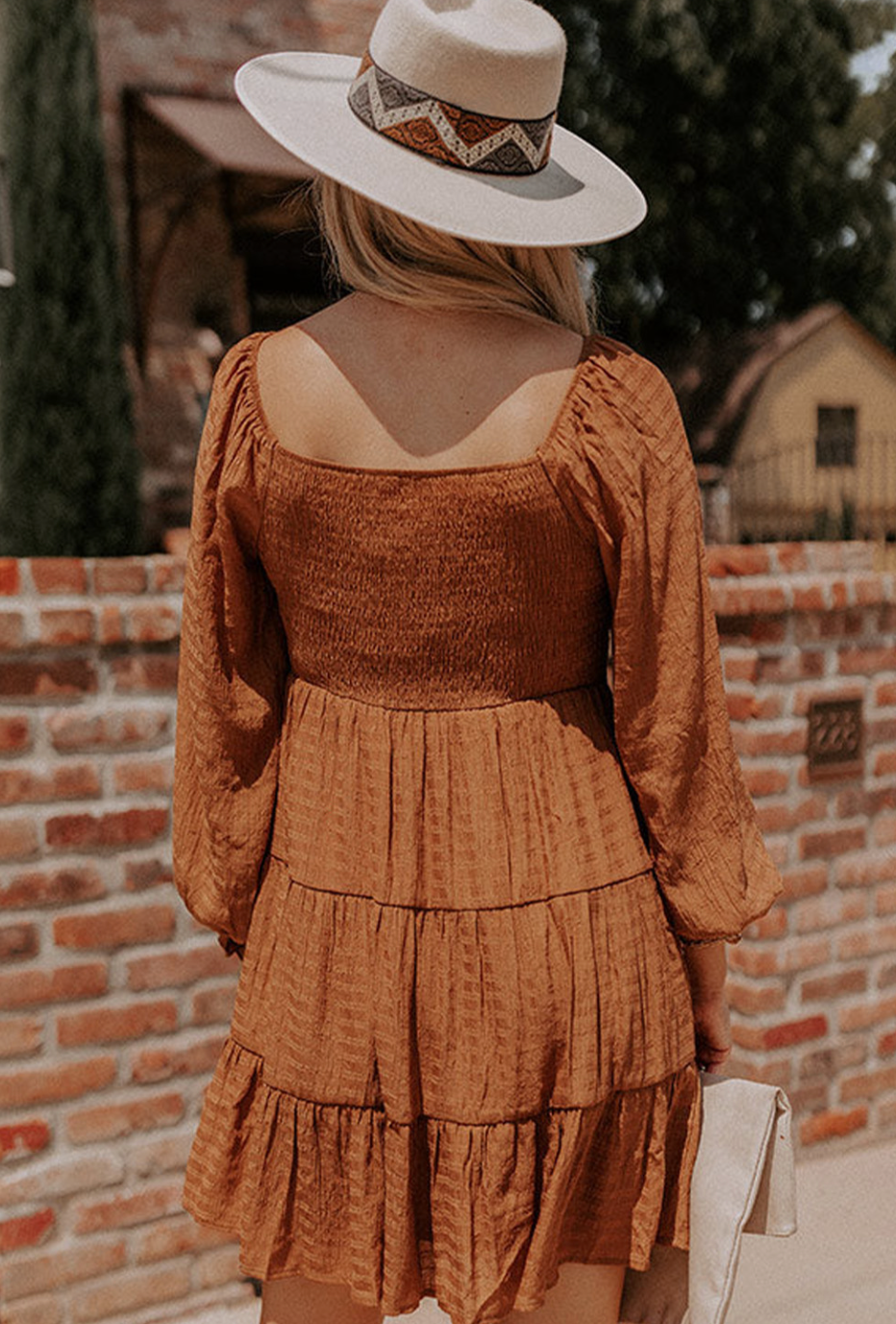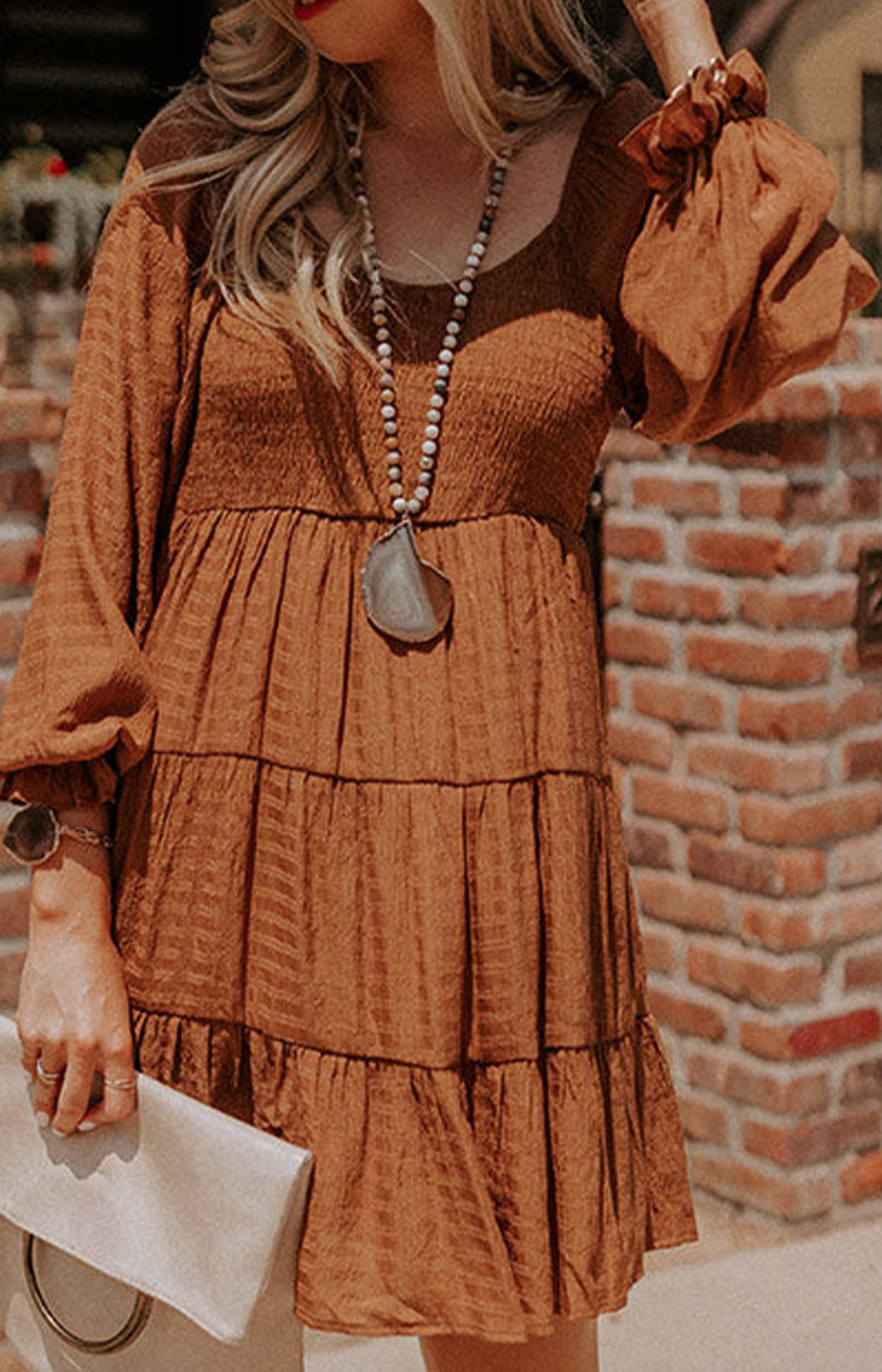 Hello Fall. It's me wanting to wear this dress with my boots. I'm kinda ready. Loving the nice weather but love the fun Fall finds right now too. I'm torn! This one is a great fit ever time as it's smocked in the front and back. She's a keeper!