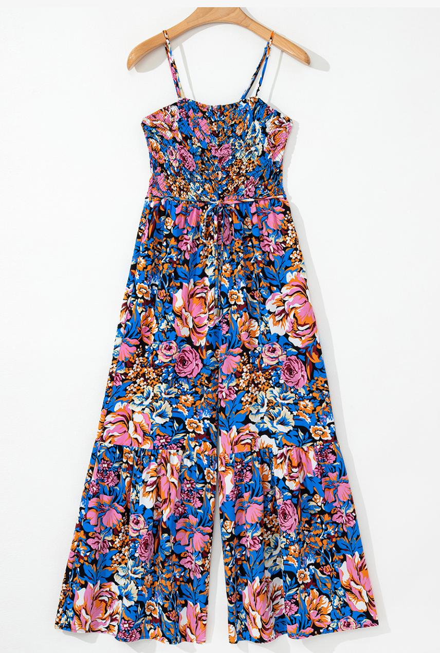 Smocked top and adjustable straps. A small floral with wide legs this jumpsuit is a dream.