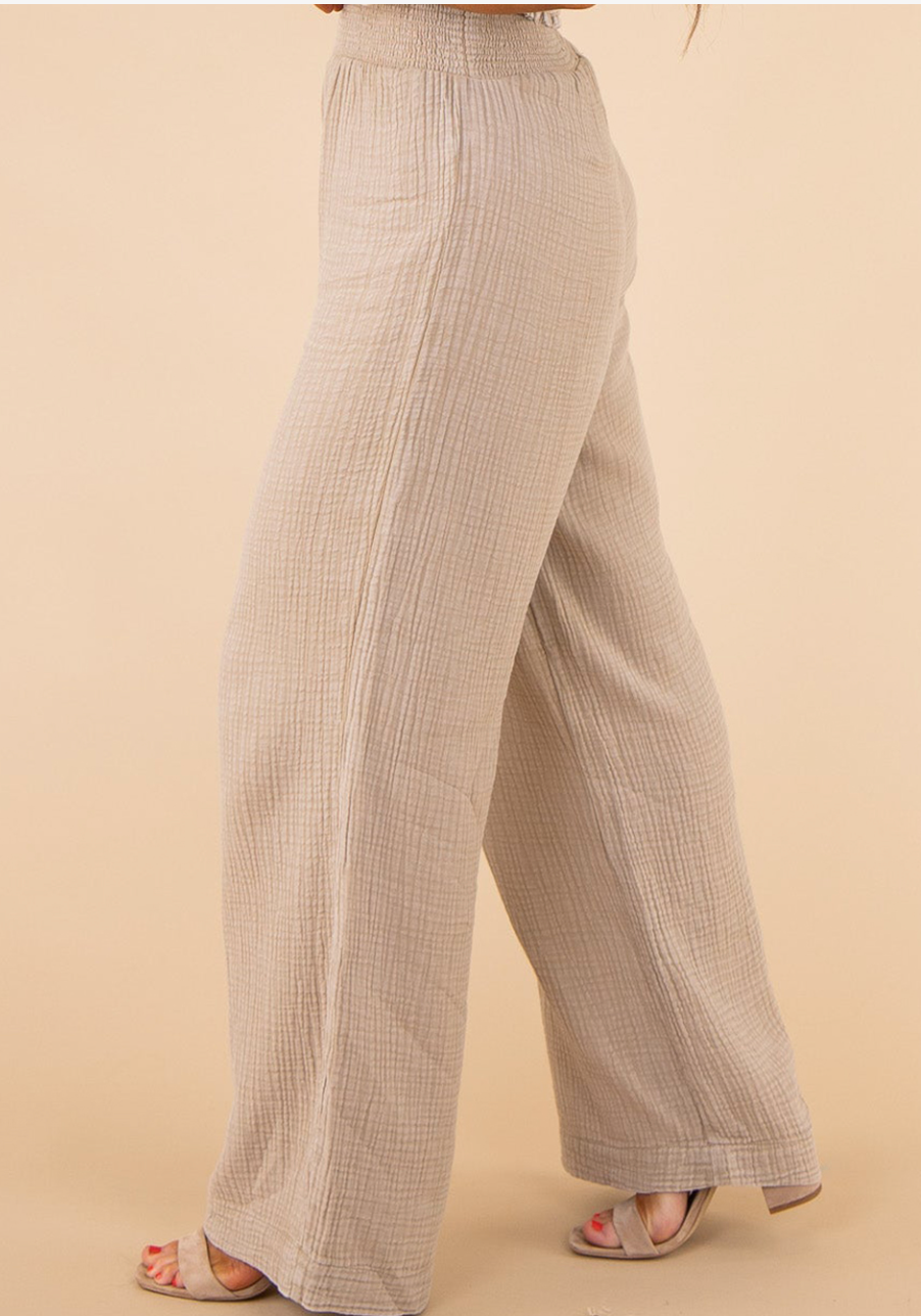 Smocked cotton is all the rage and his color is fun to go with all the things. A wide leg but not too much. Plus, who doesn't love a smocked waistband.