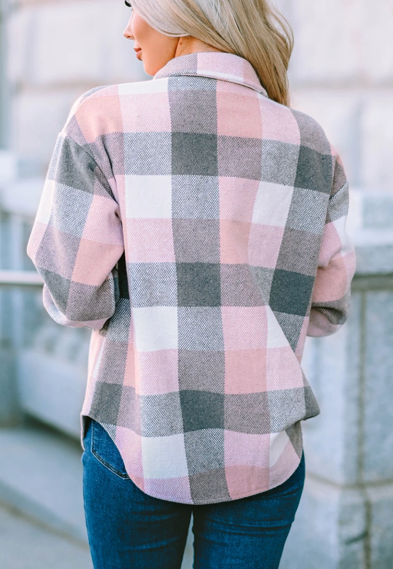 Pre-Order Pink Gray Plaid Color Block Buttoned Long Sleeve Jacket with Pocket