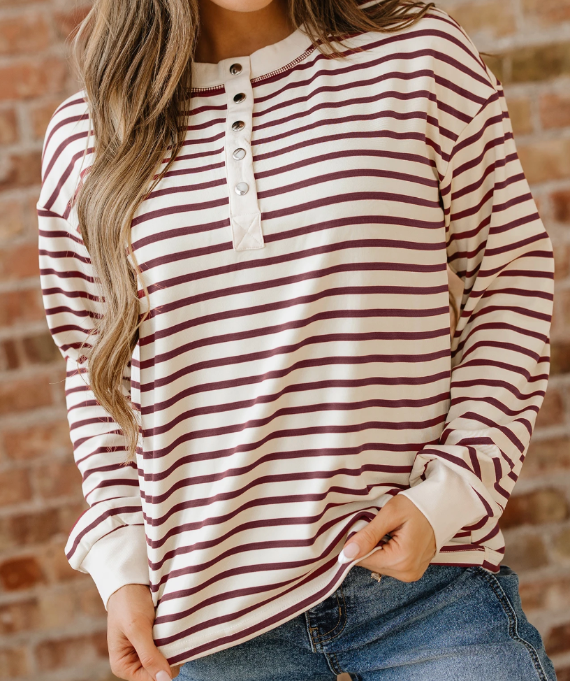 Stripes are my friend when they are the right one and this one is. I love the snaps that allow for a lower neckline and am going to size down for ore of a fitted look to wear with all my wide leg pants.