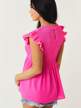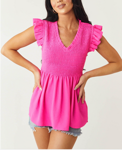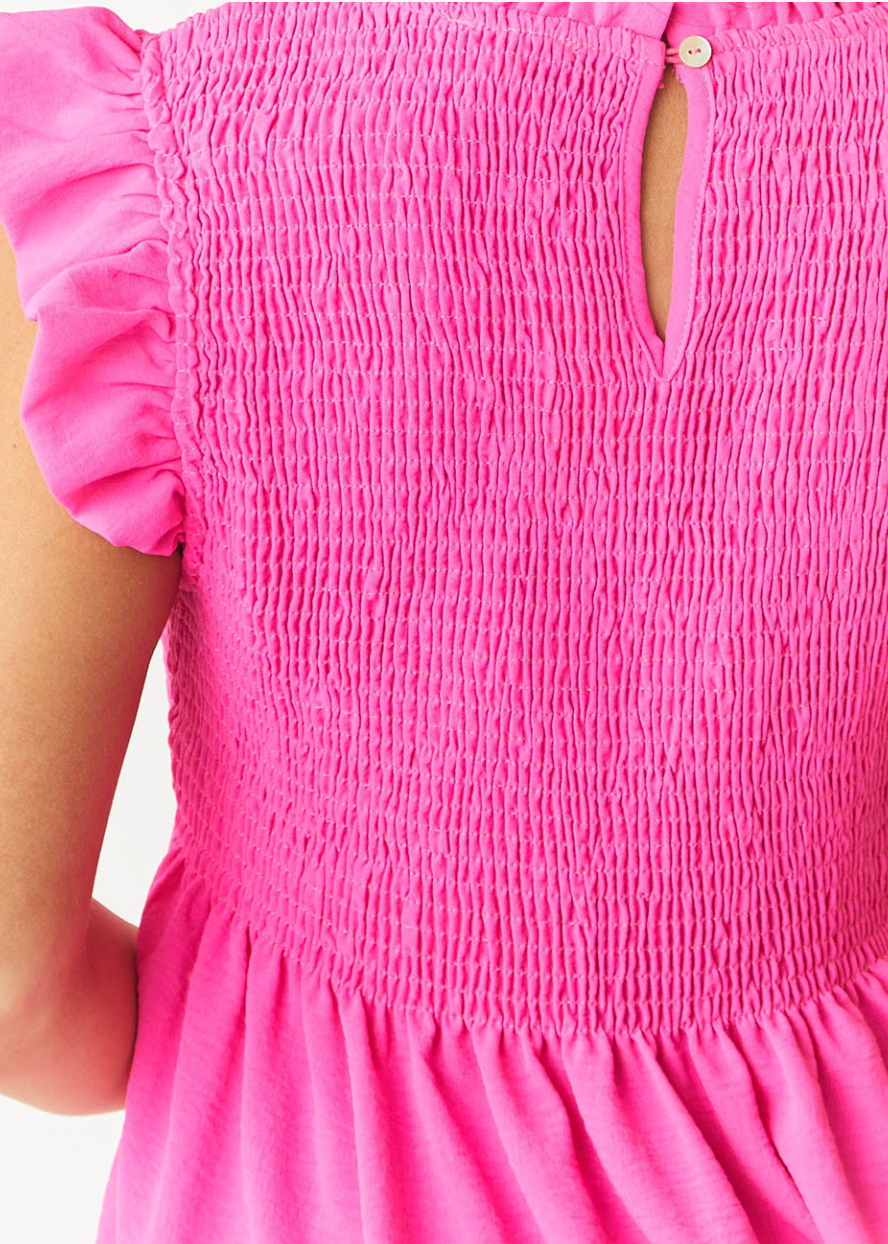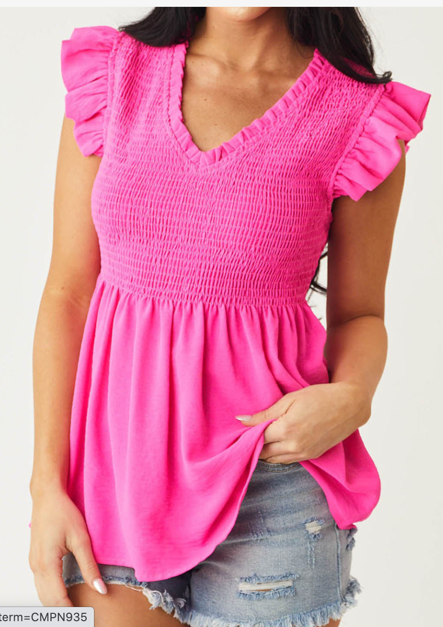 Hello tan. The pink of this top is so great the cut and fit are even better. Smocked top for a great fit on a lot of different bust lines and great tummy coverage too. She's a winner!