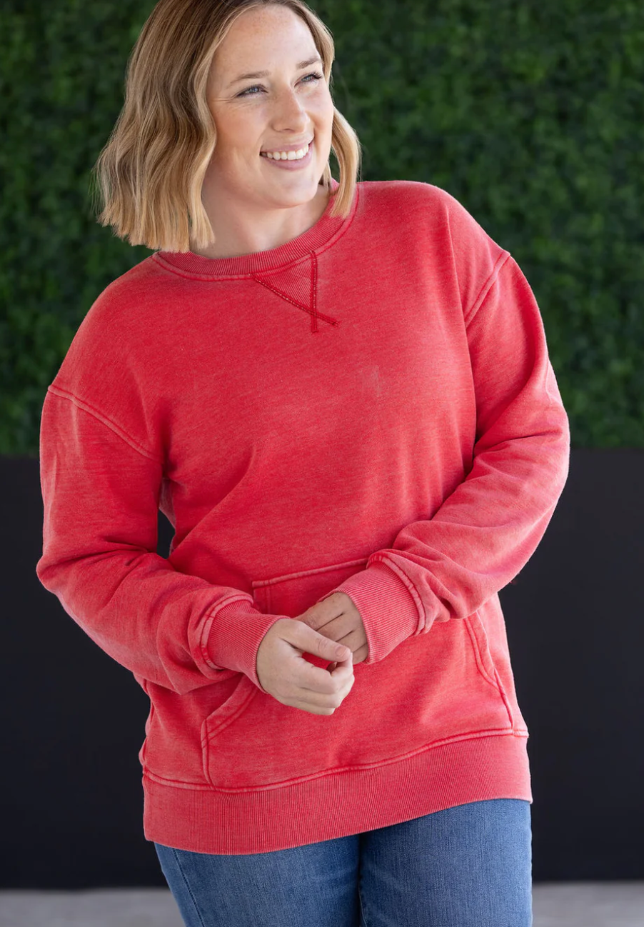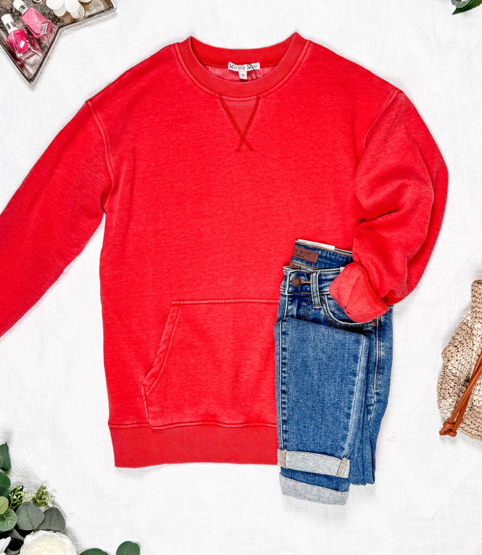 Slip into casual comfort with our Vintage Wash Pocket Pullover. With a straight bottom hem, stretchy cuffs and hem, and a convenient kangaroo pocket, this pullover is perfect for everyday wear. And the vintage wash adds a touch of style to any outfit!