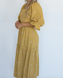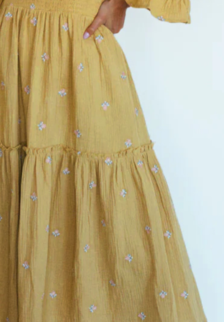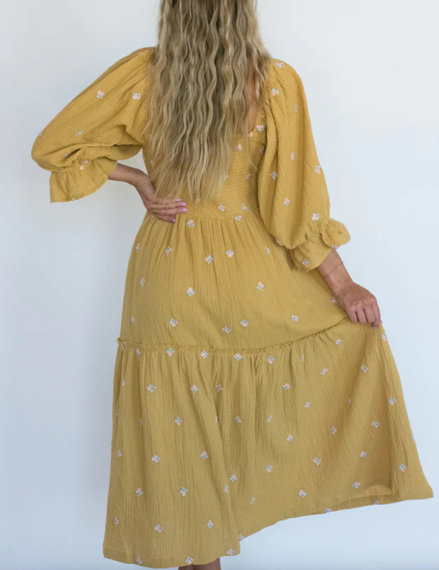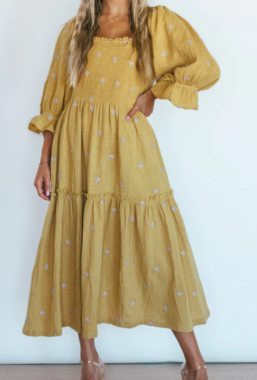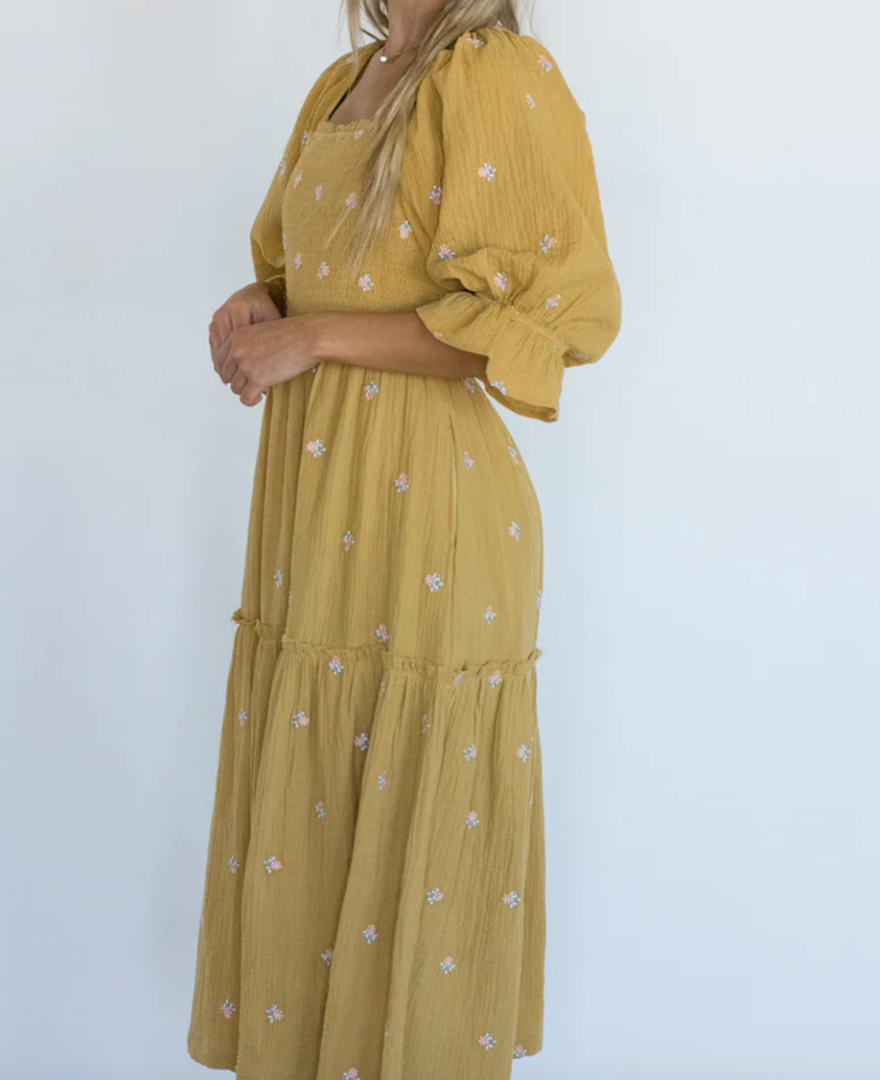 Another dupe at half the cost and I'm thrilled. I'm a gold/yellow girl and know I will love the fit of this one because of the smocked top.