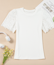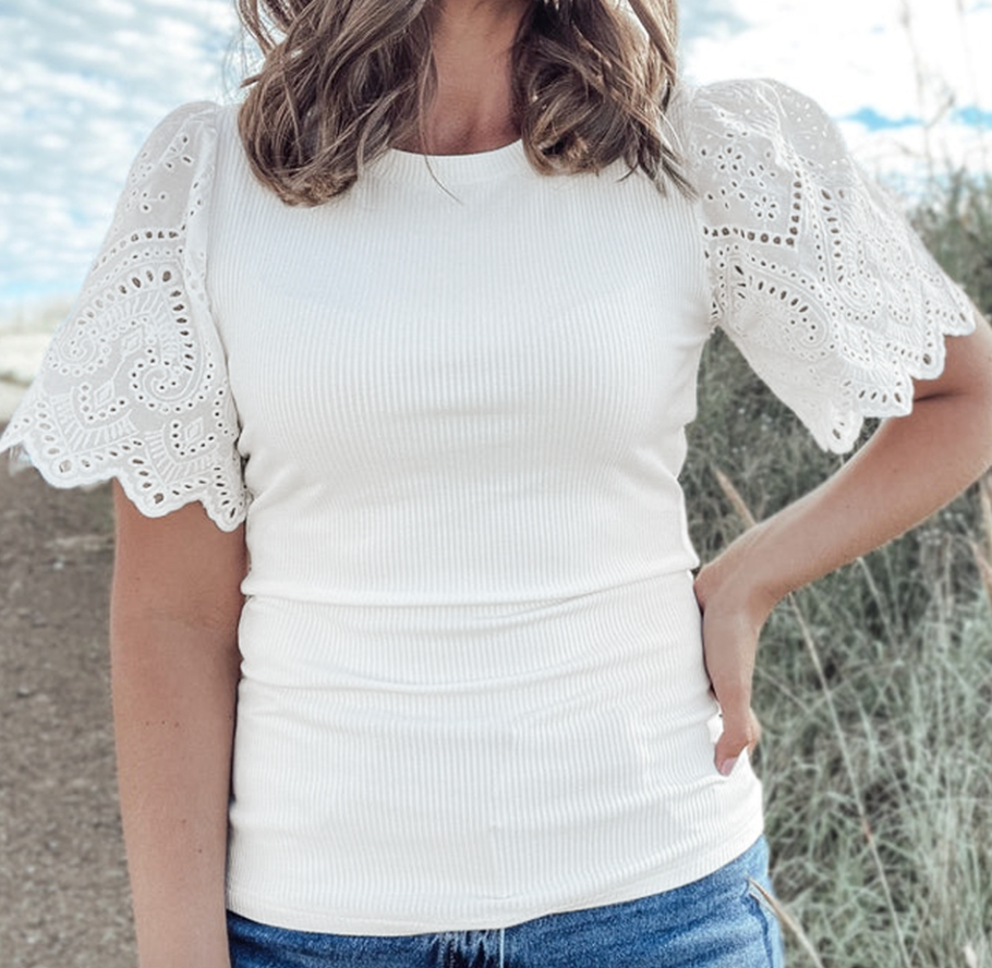 She's the perfect top to tuck with our wide leg pants. Fun girly details on the sleeve and in a classic white. Ribbed fabric with great stretch.